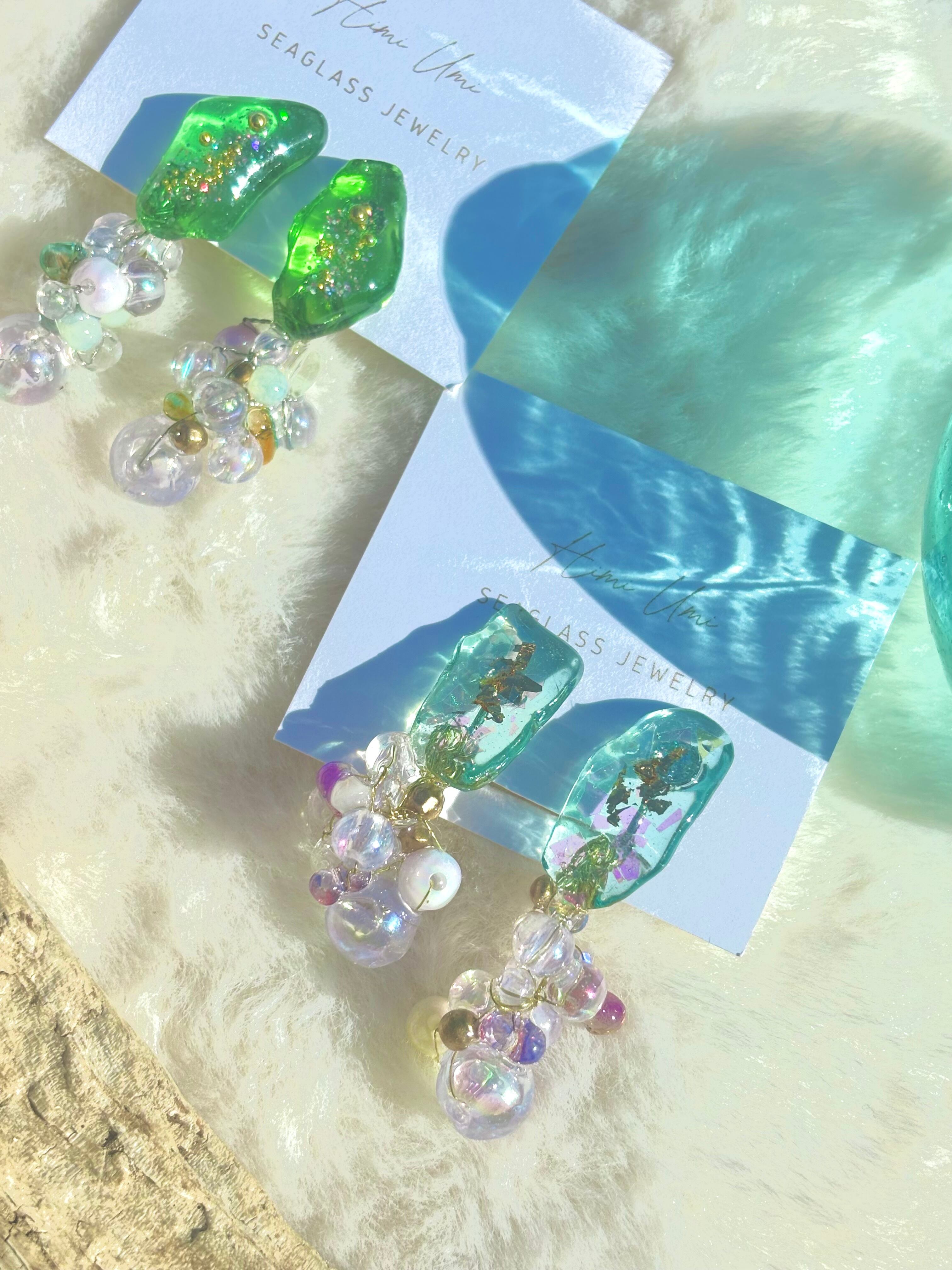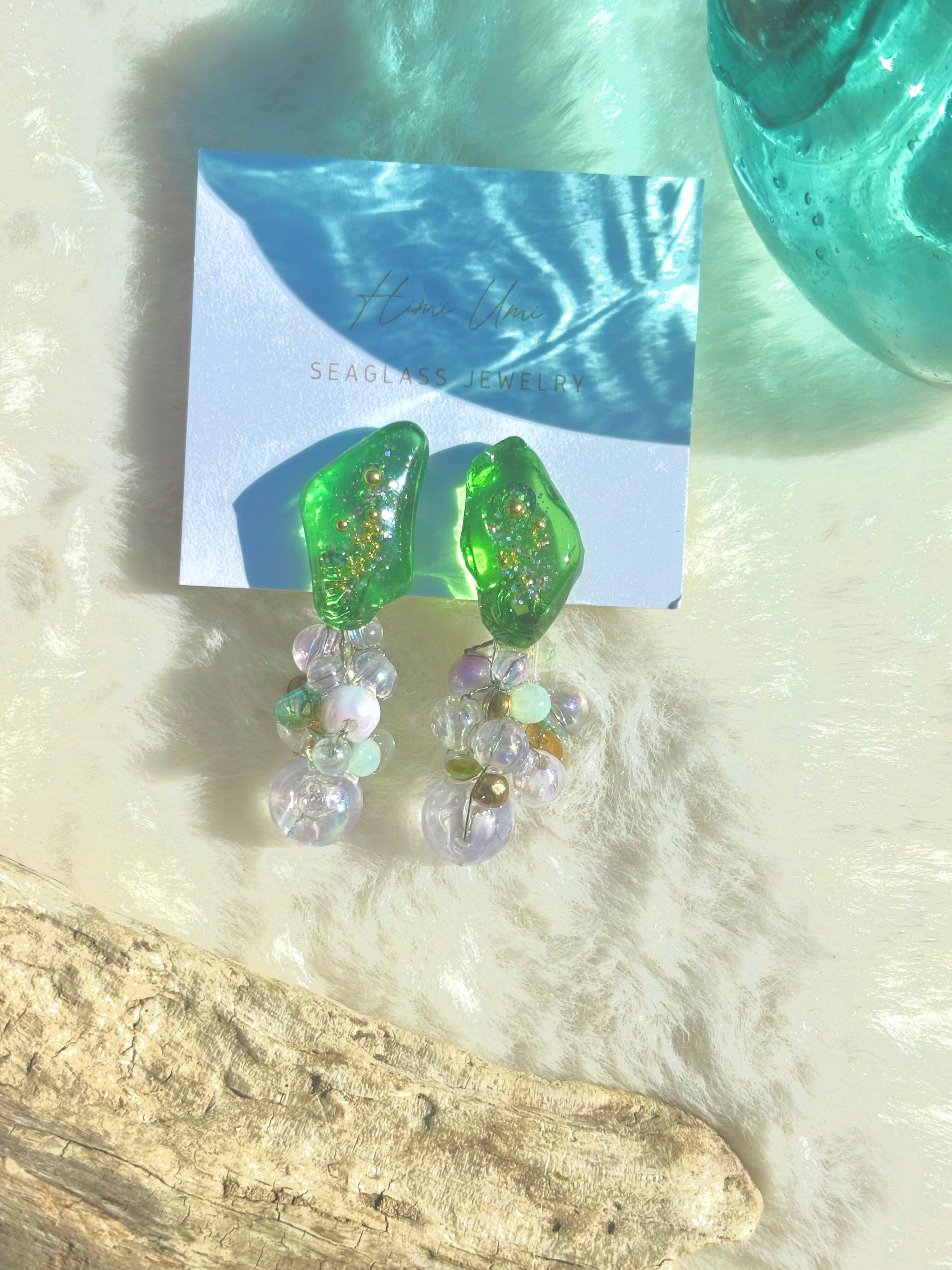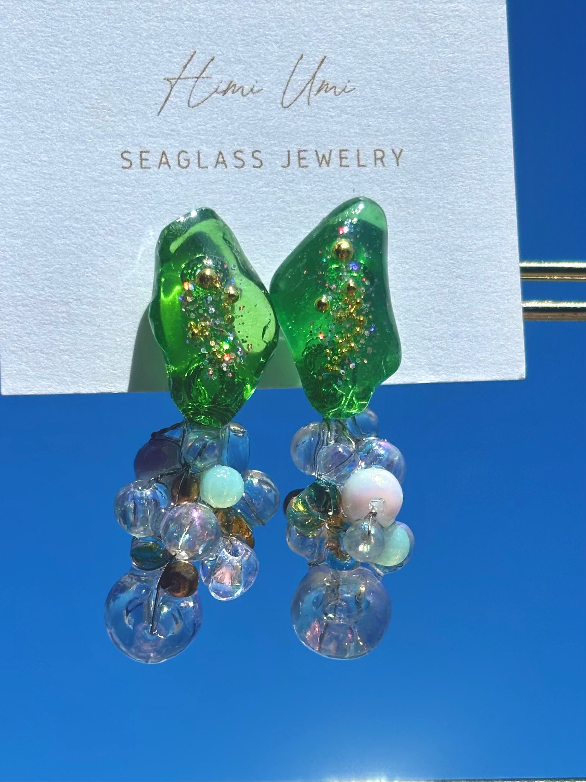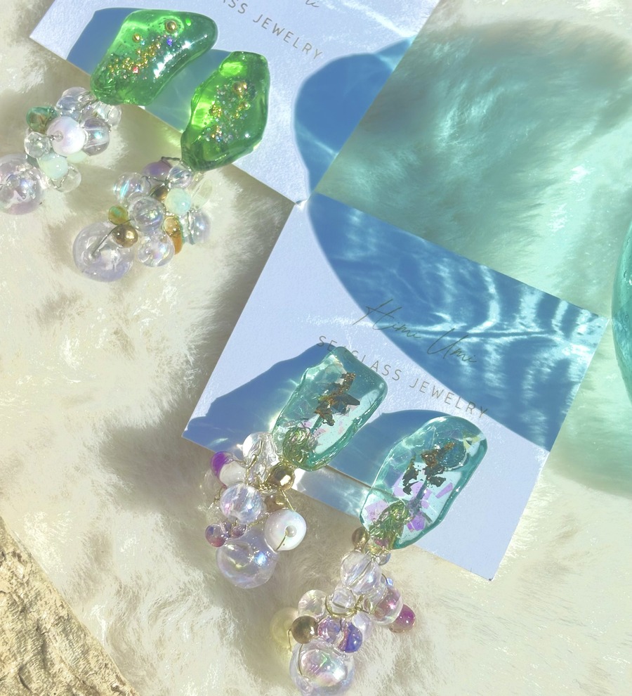 きれいなグリーンカラーは着色していない、そのままのシーグラスを活かしています。Himi Umiのシーグラスは色を加えたり、削って形を変えたりしていません。
