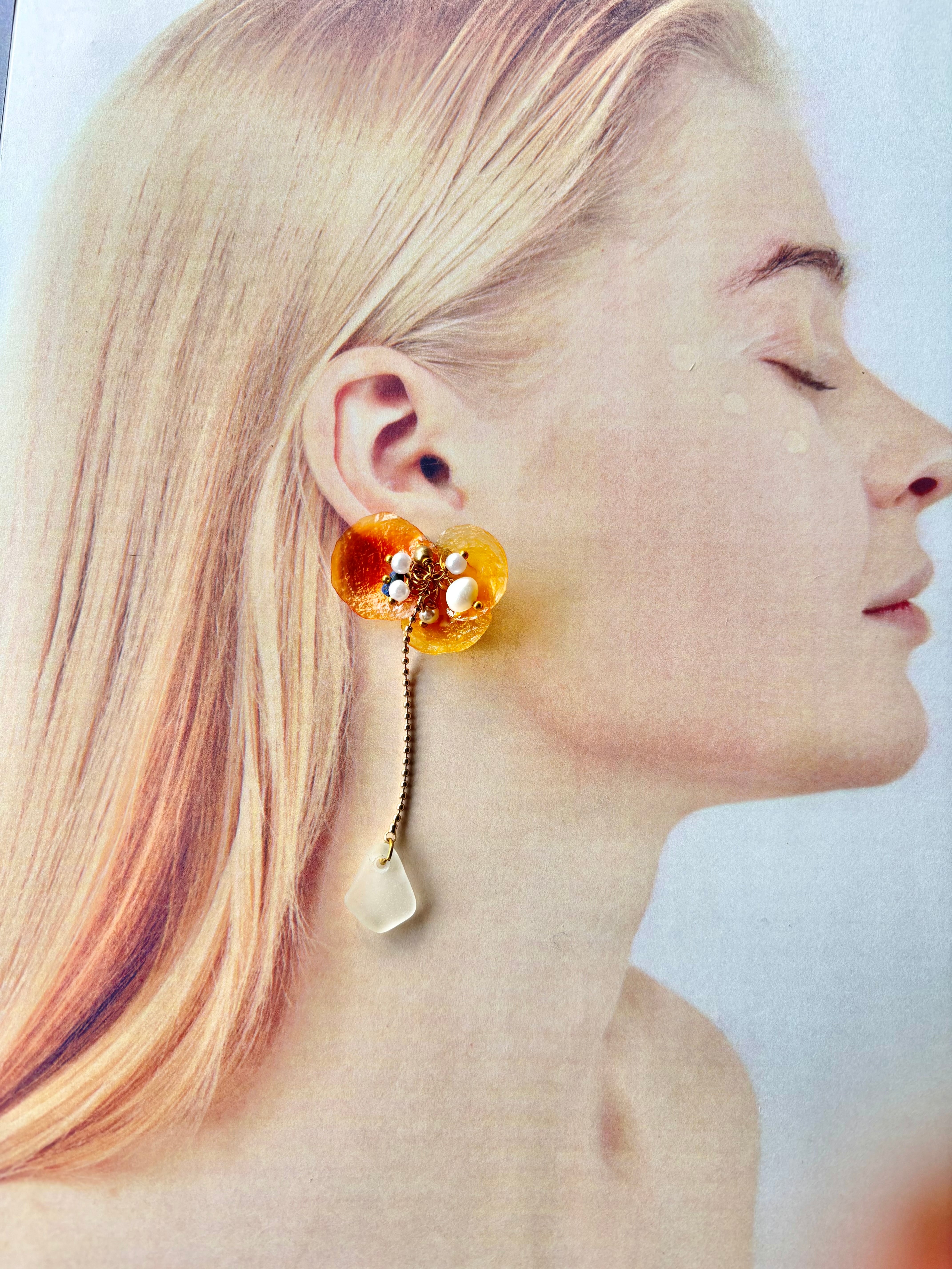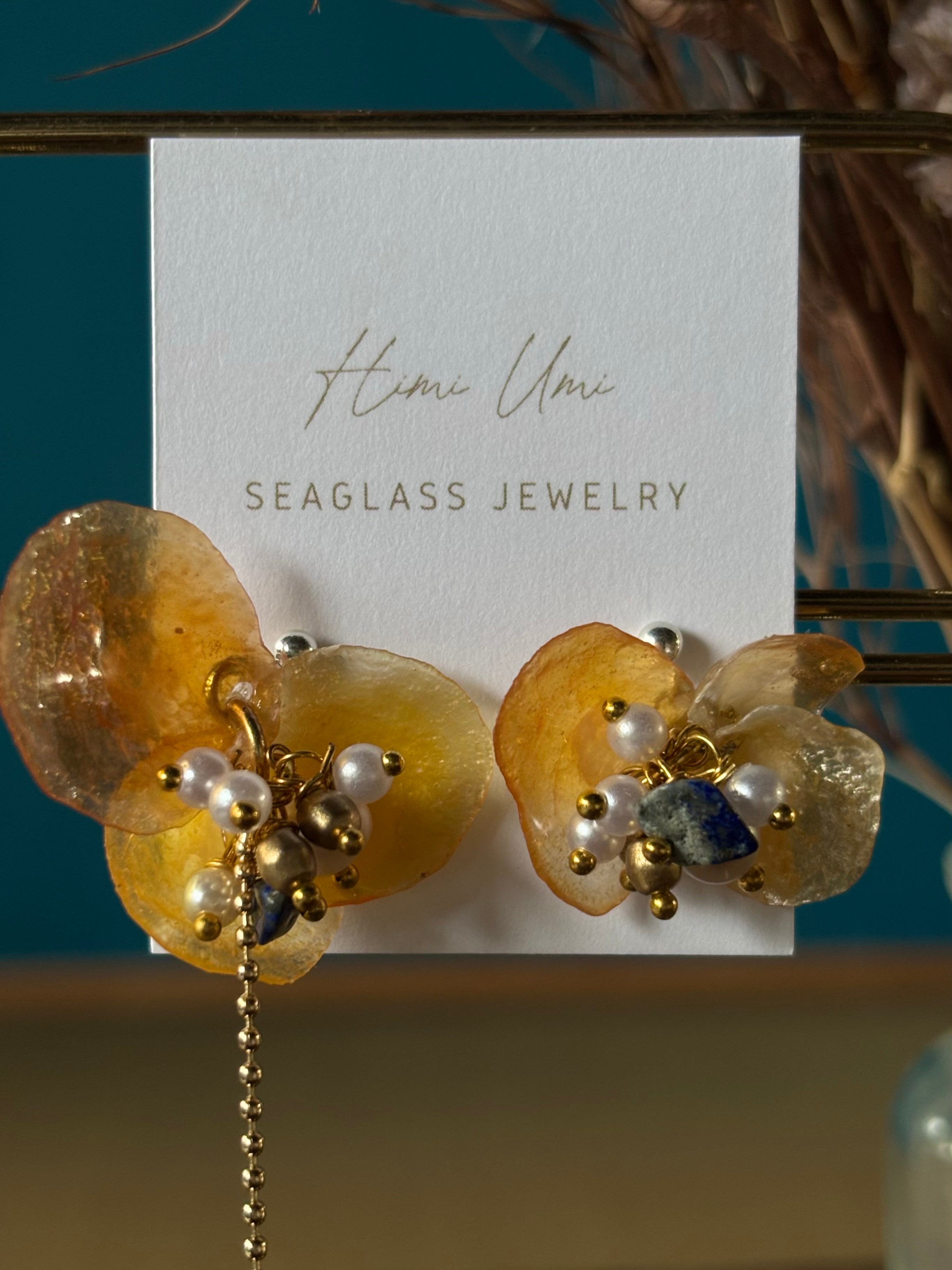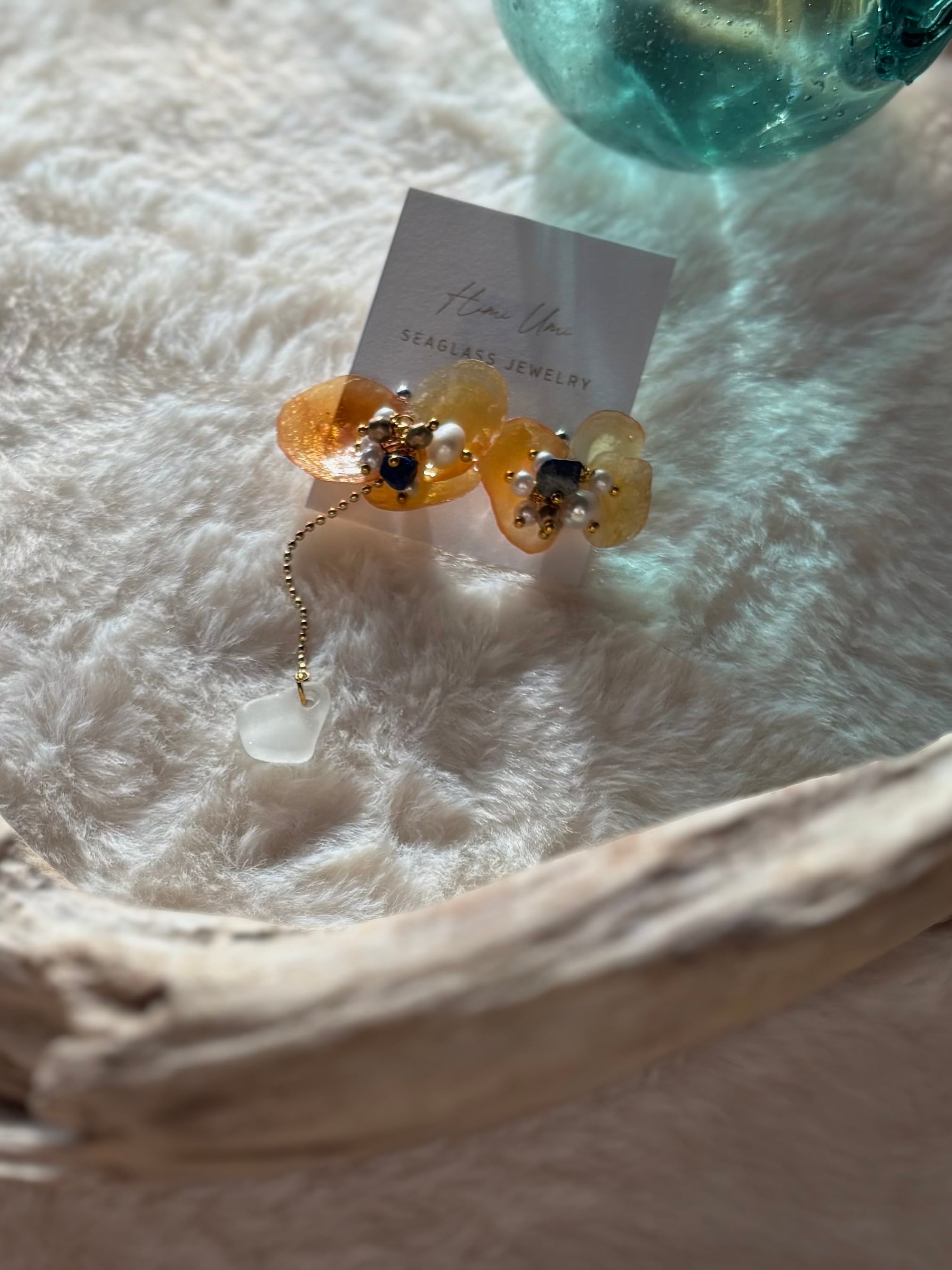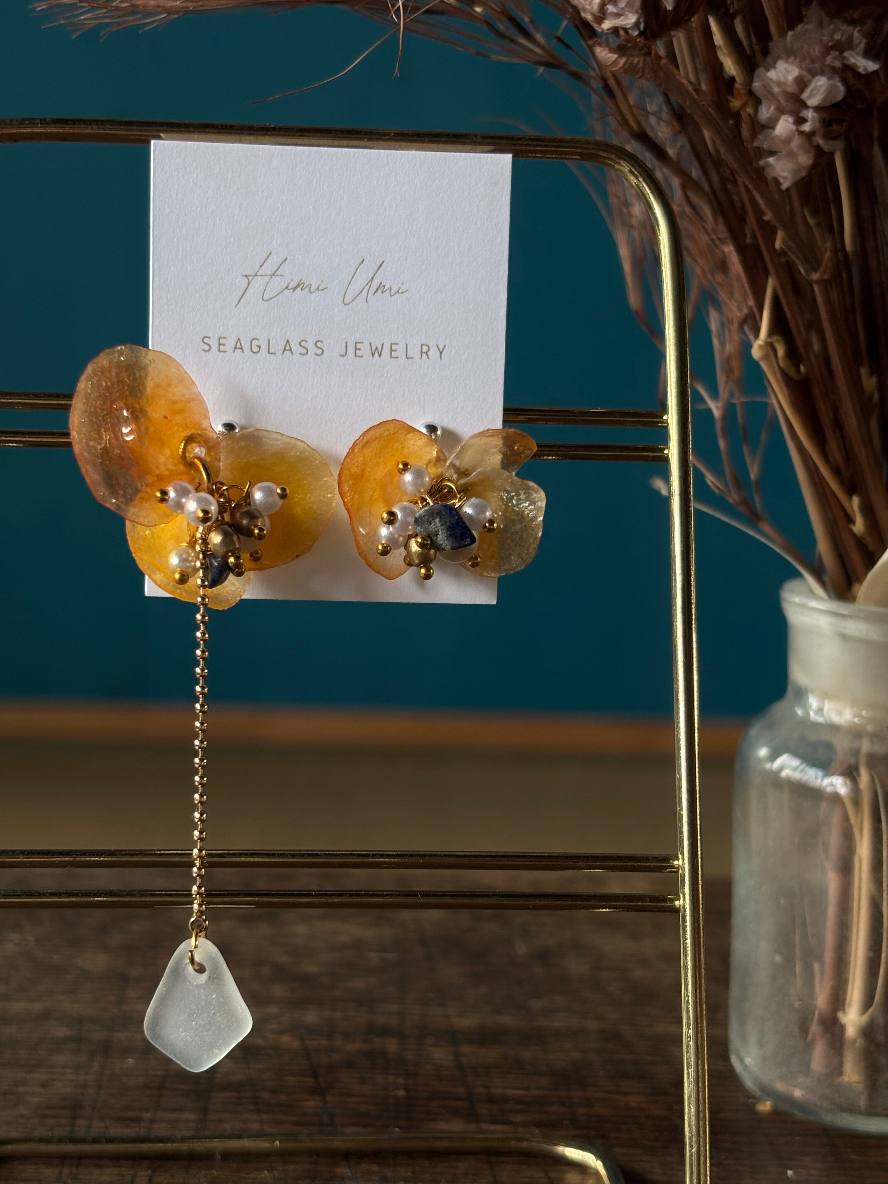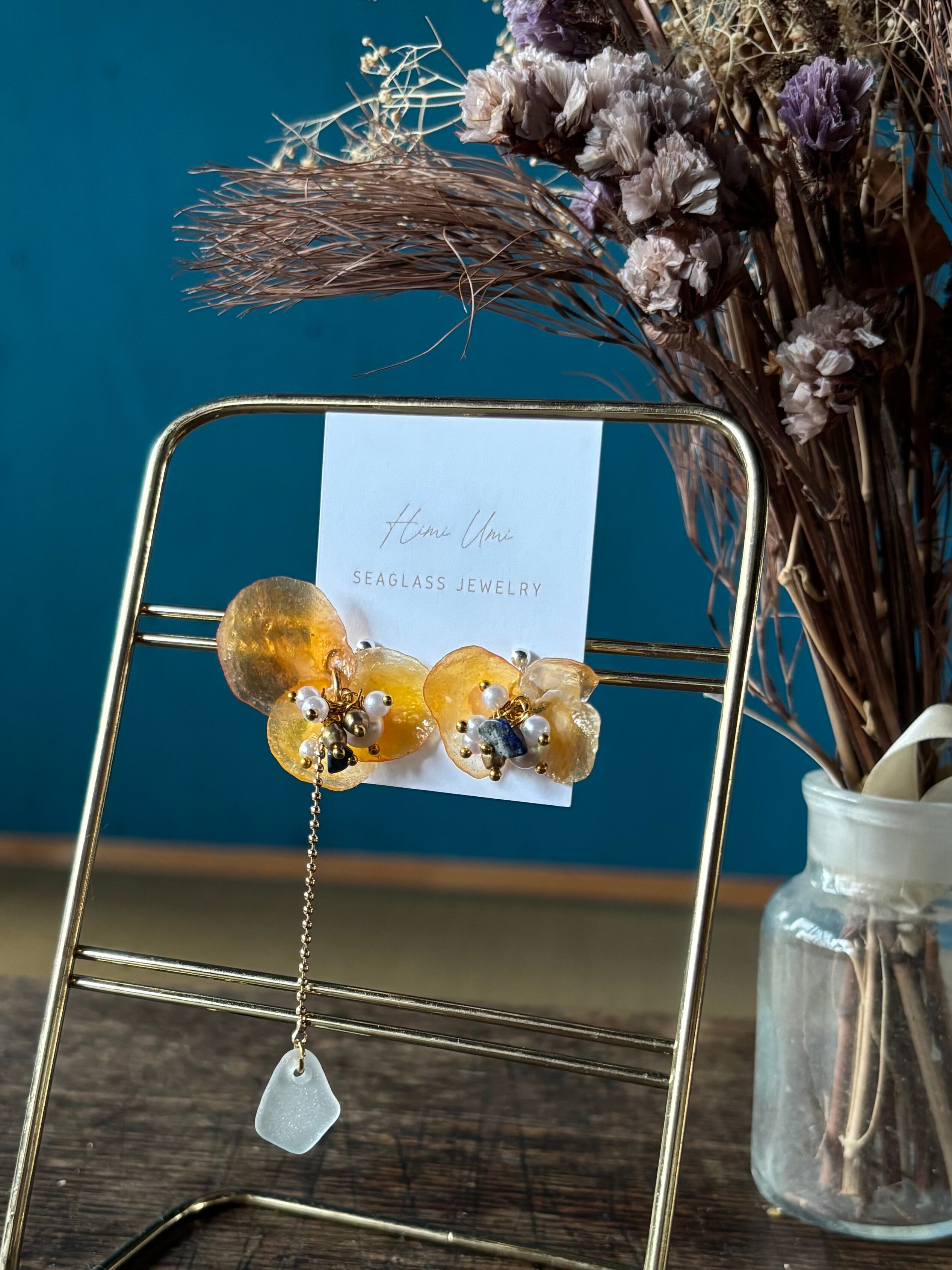 ナミマガシワという貝殻(薄く繊細で花びらのような形の貝)と氷見シーグラス、天然石を使ったアクセサリーです。美しく儚い貴重な貝殻を使い、お花の花弁を表現しました。花の中心にはパールとラピスラズリの天然石ビーズを使用して花芯を表現。ナミマガシワは「幸せを呼ぶ貝」とも呼ばれていて、自分へのご褒美や、幸せを願って大切な方へのギフトとしても。金具変更可能です。