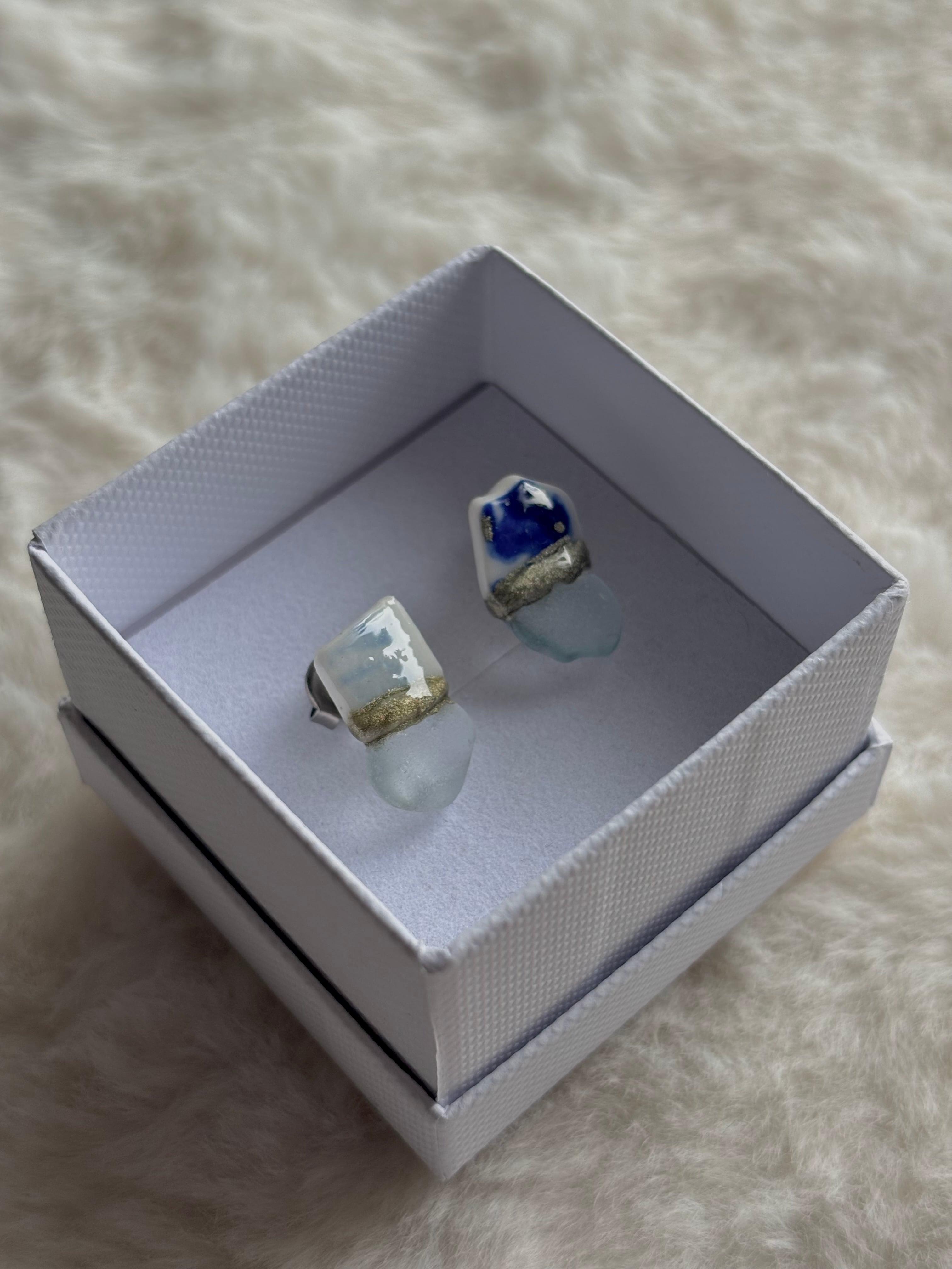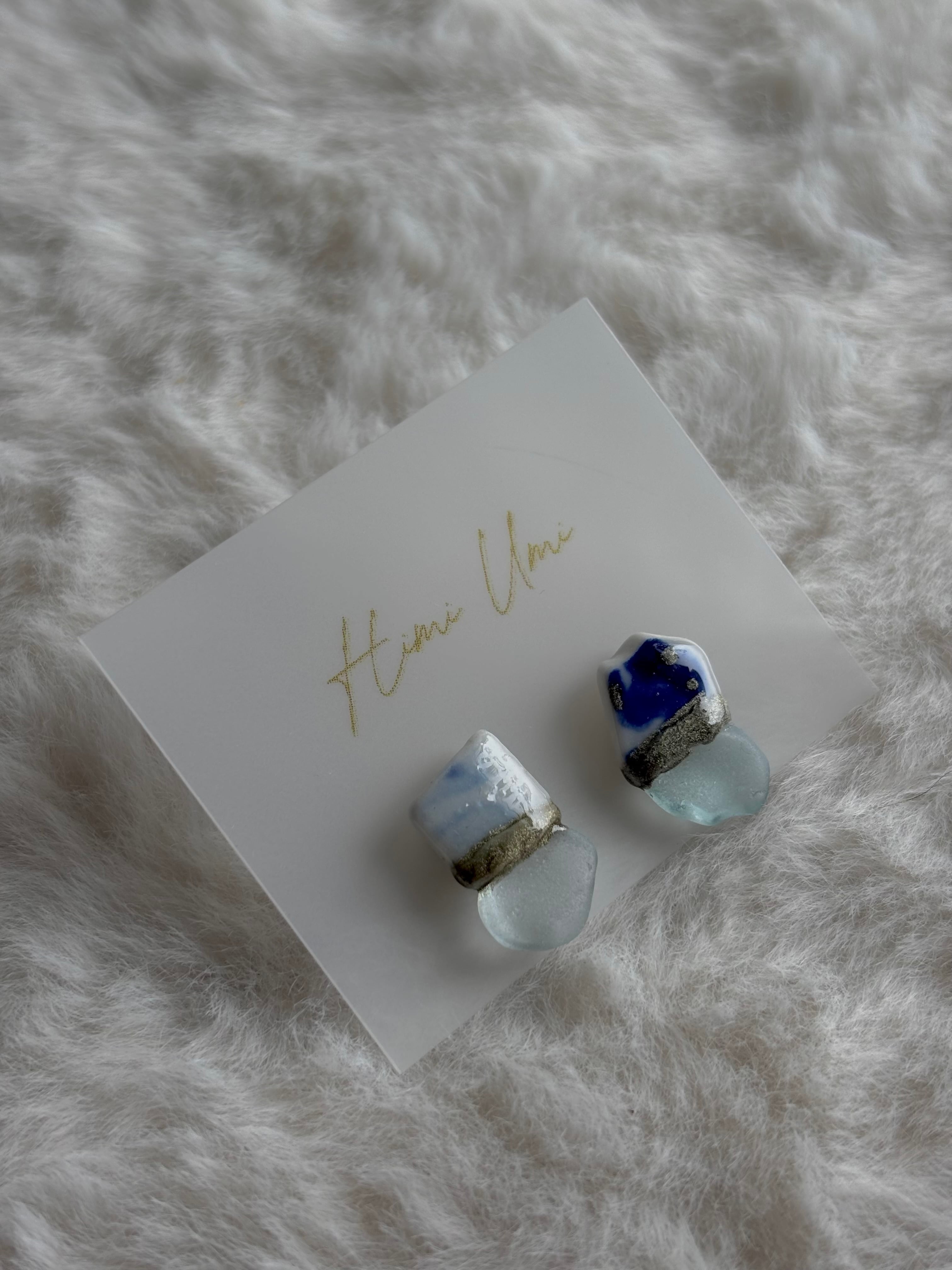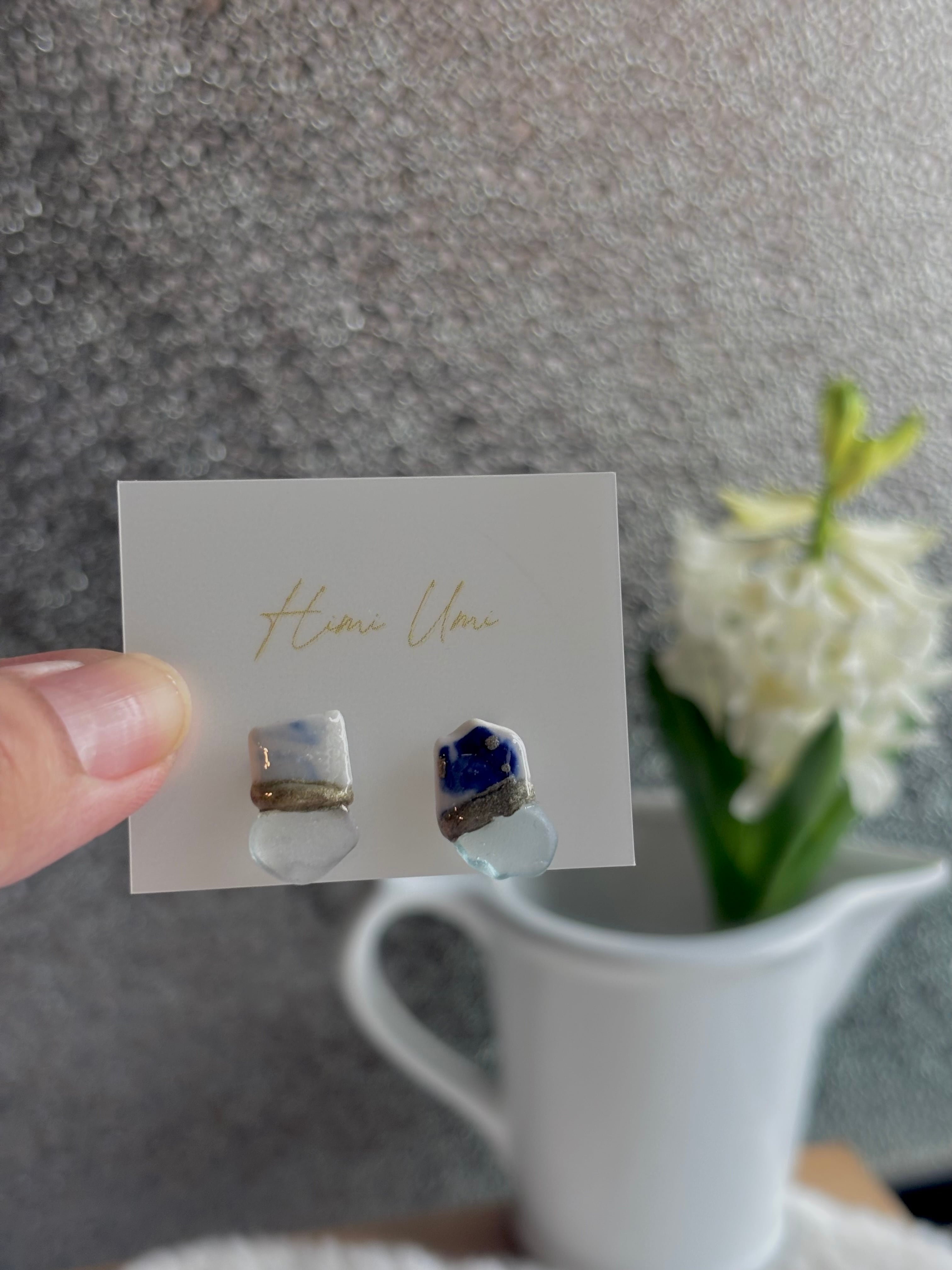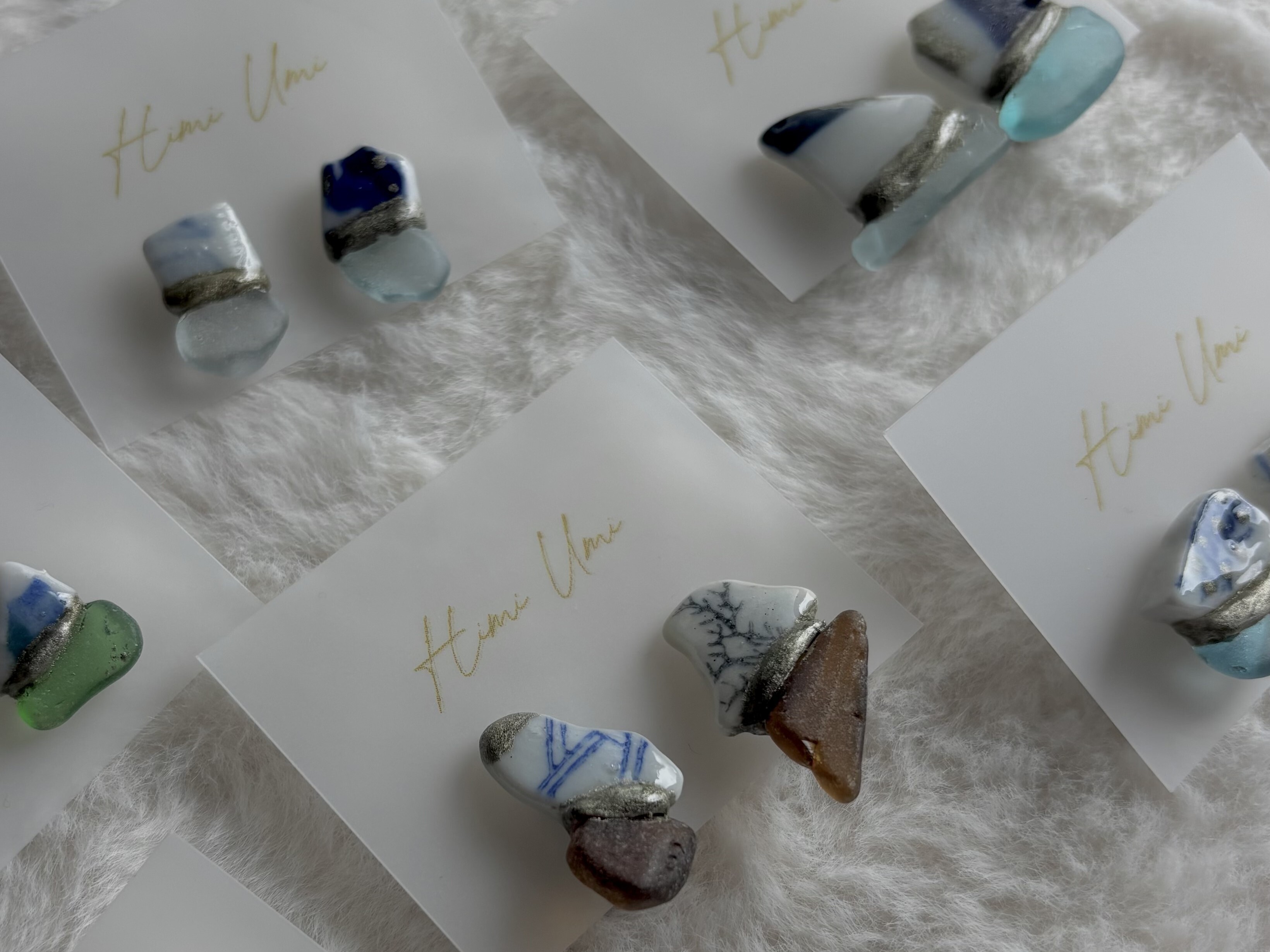 【シー陶器とは】シー陶器とは海の漂着陶器片のことです。誰かが落としたり捨てた陶器が割れて破片となり、波に揉まれると角が取れていきます。海の中を何年もさまよい、やがて砂浜へと戻ってきます。それらがシー陶器と呼ばれています。Himi Umiはすべて氷見の海でみつけたシー陶器を使って制作しています。
