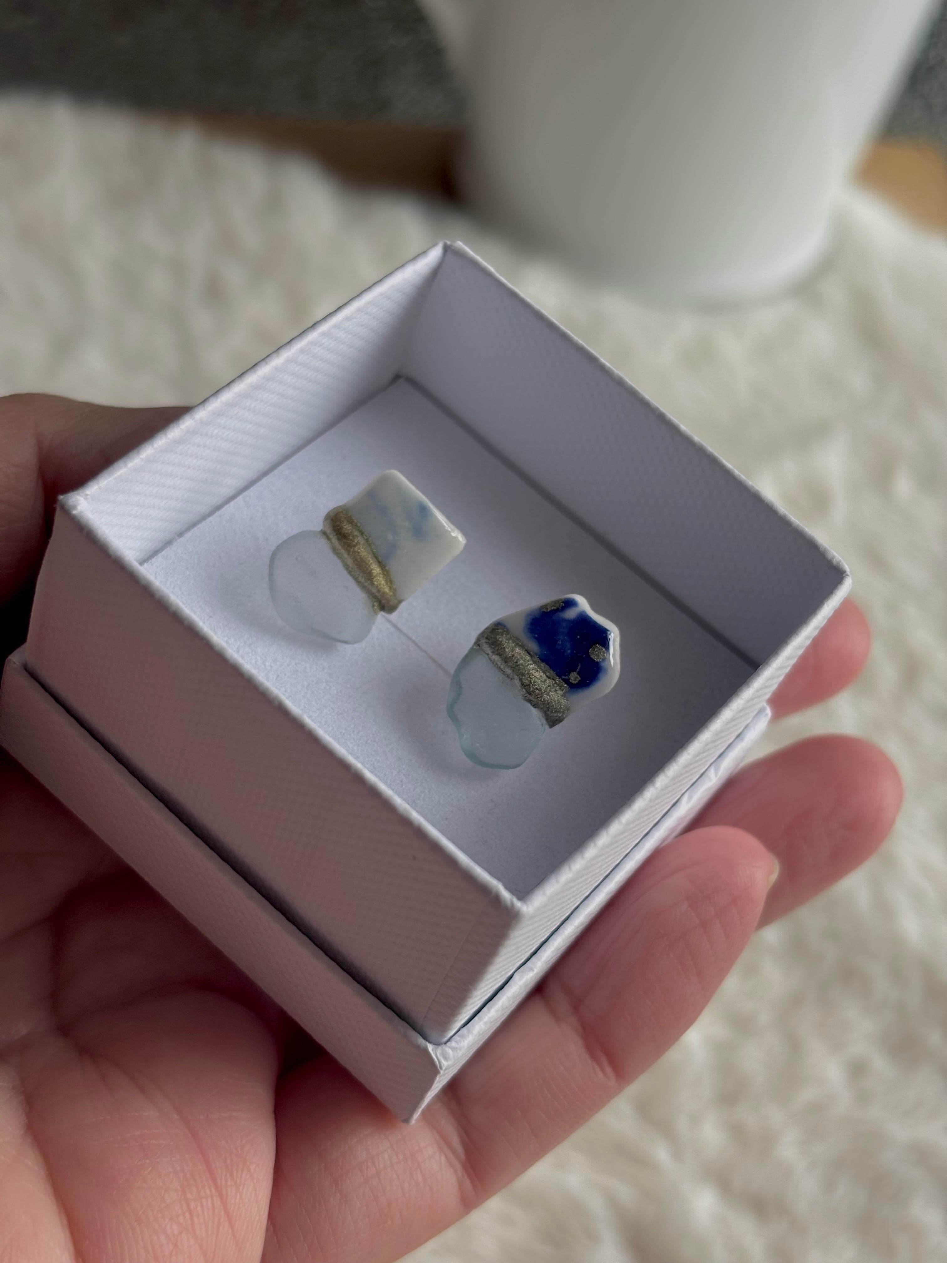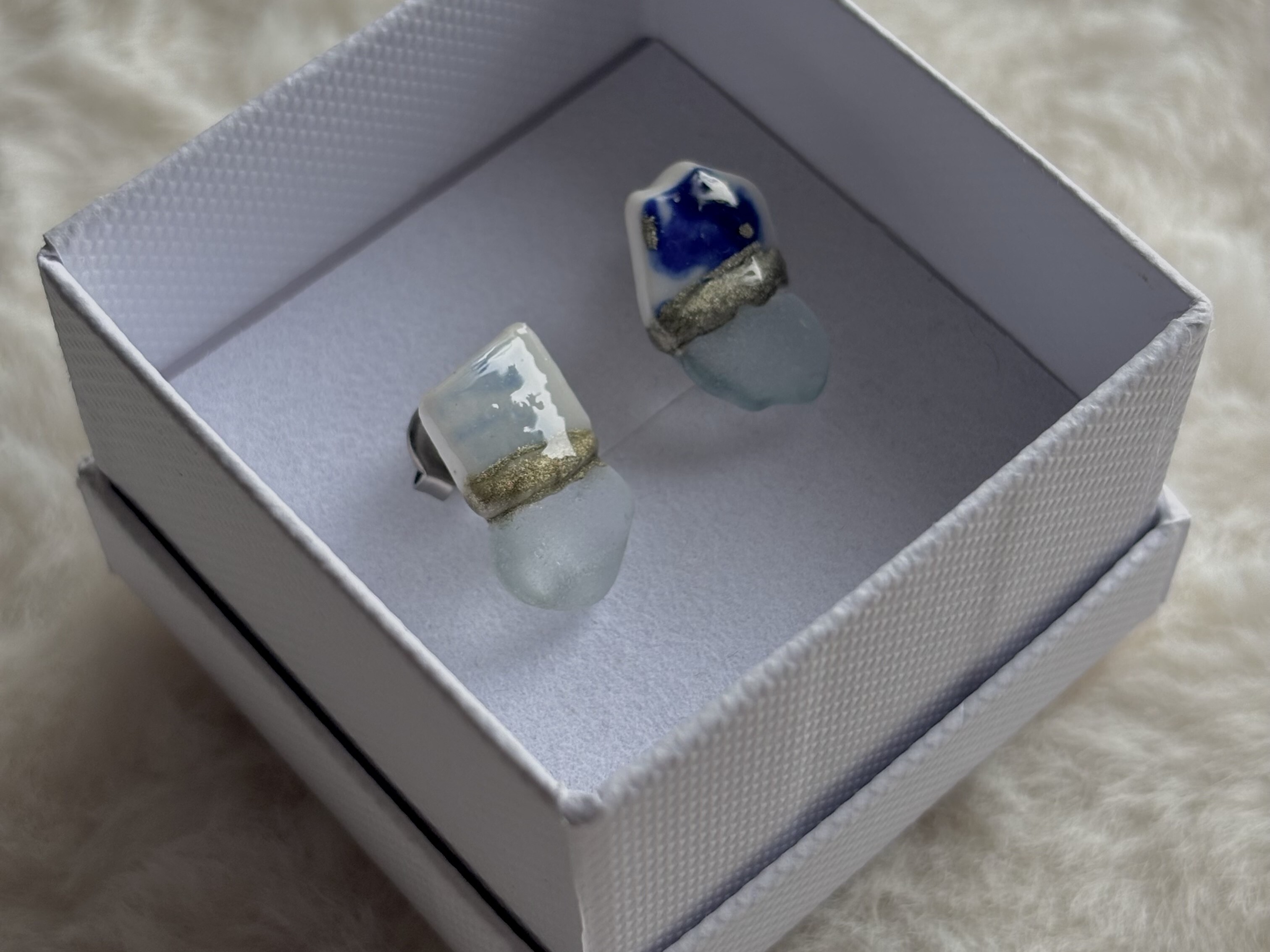 - シー陶器を錫継ぎ技法でシーグラスと継ないだデザインです。シー陶器の柄が一期一会の特徴です。