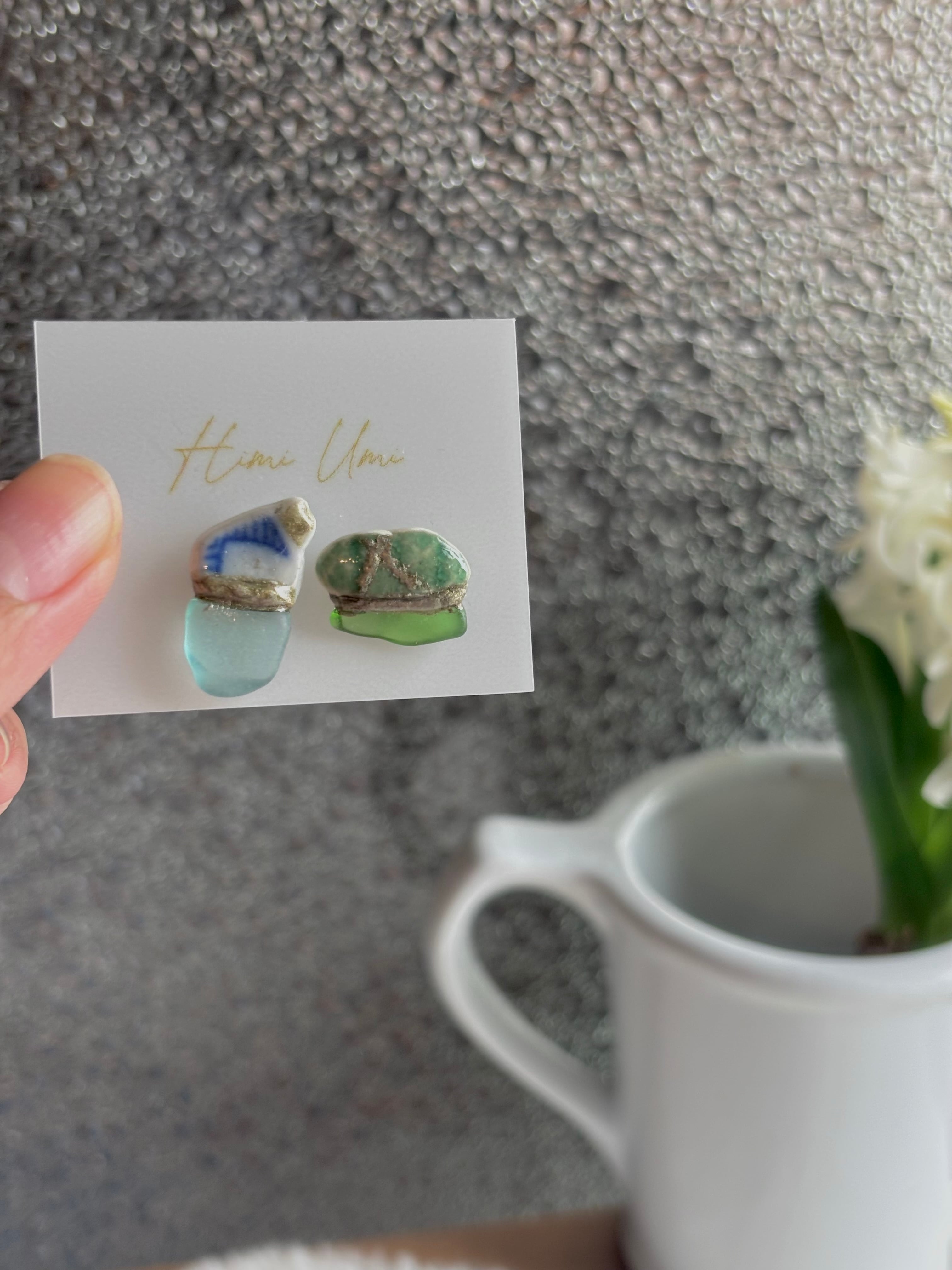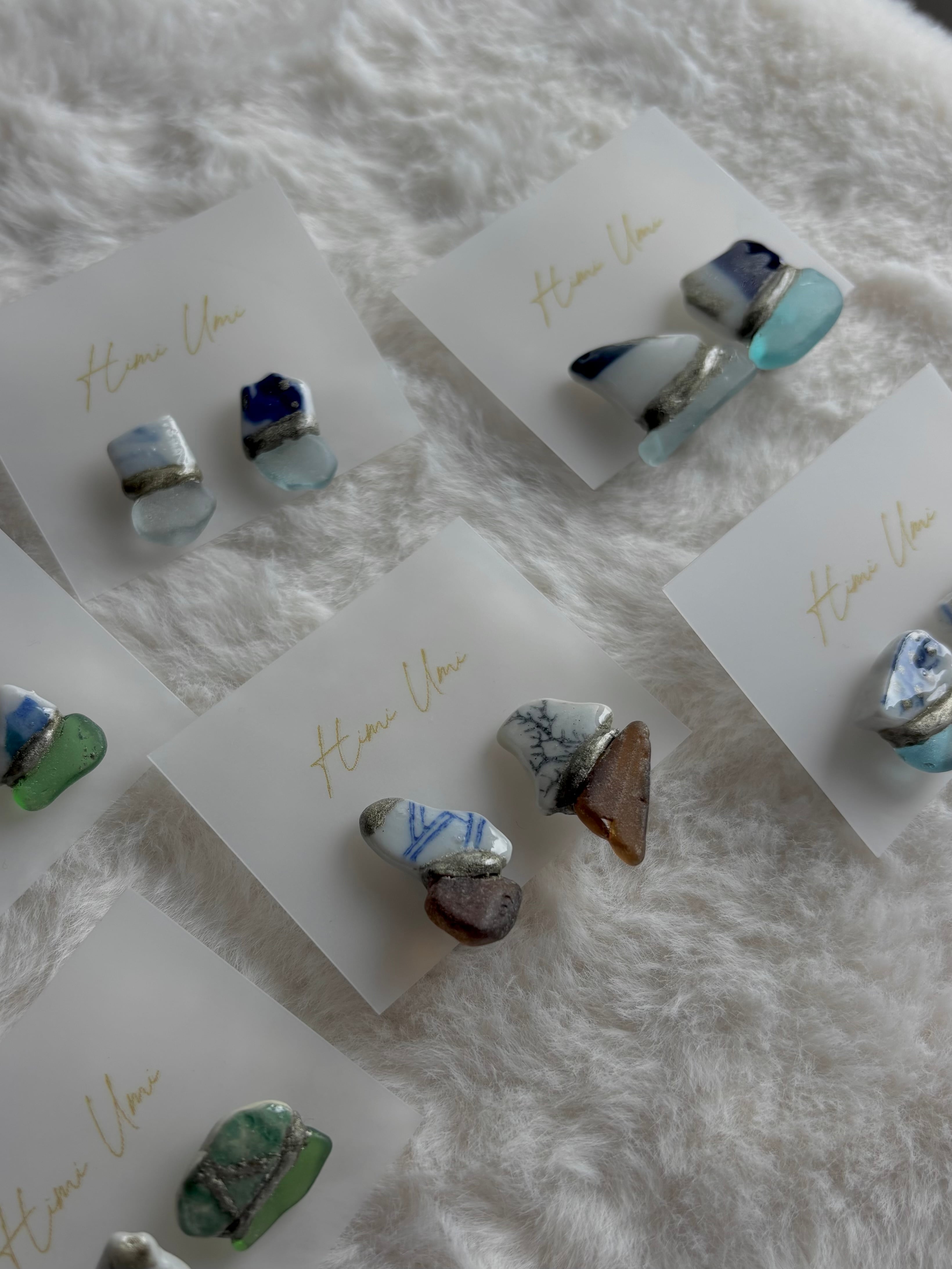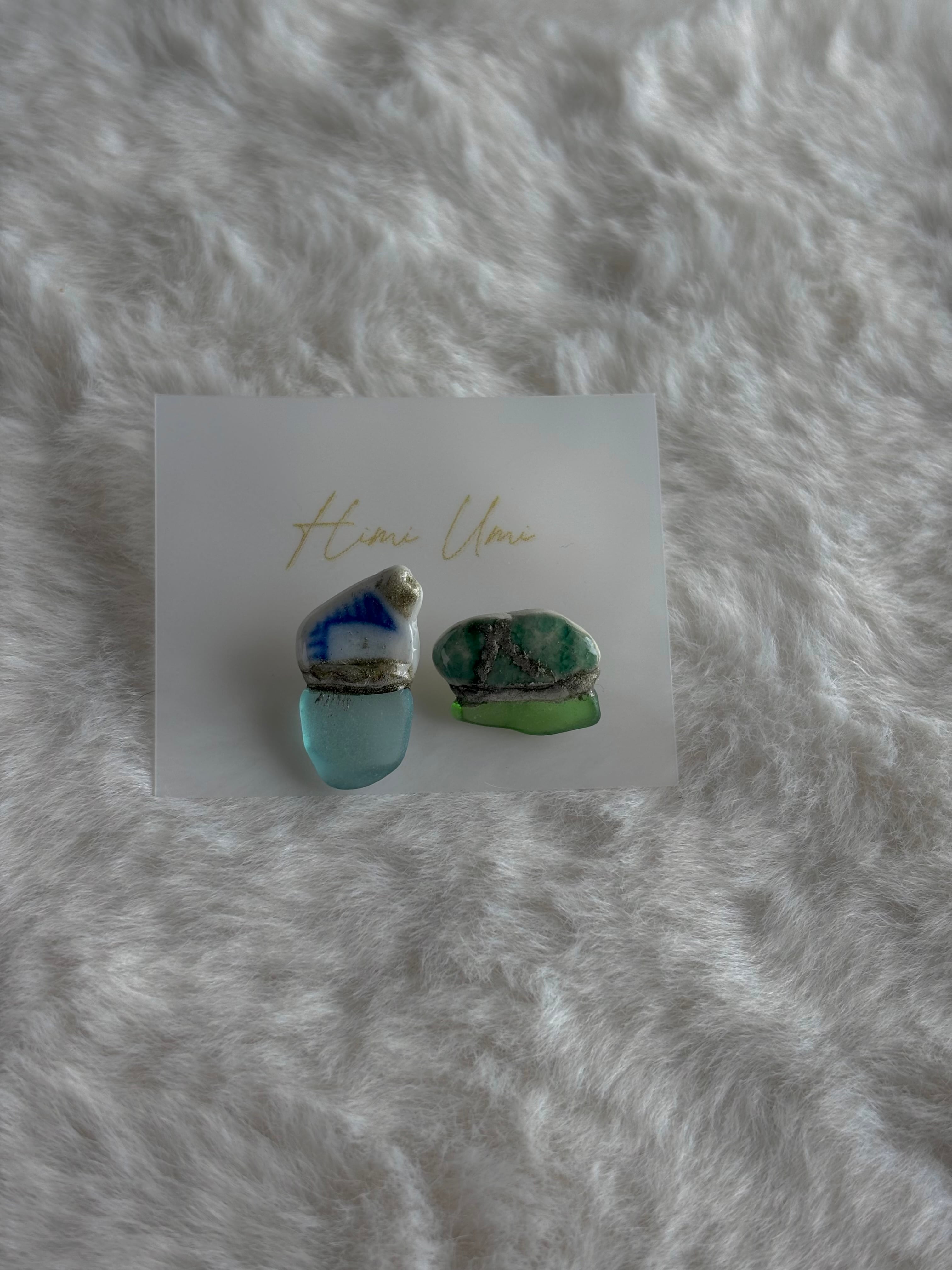 【シー陶器とは】シー陶器とは海の漂着陶器片のことです。誰かが落としたり捨てた陶器が割れて破片となり、波に揉まれると角が取れていきます。海の中を何年もさまよい、やがて砂浜へと戻ってきます。それらがシー陶器と呼ばれています。Himi Umiはすべて氷見の海でみつけたシー陶器を使って制作しています。