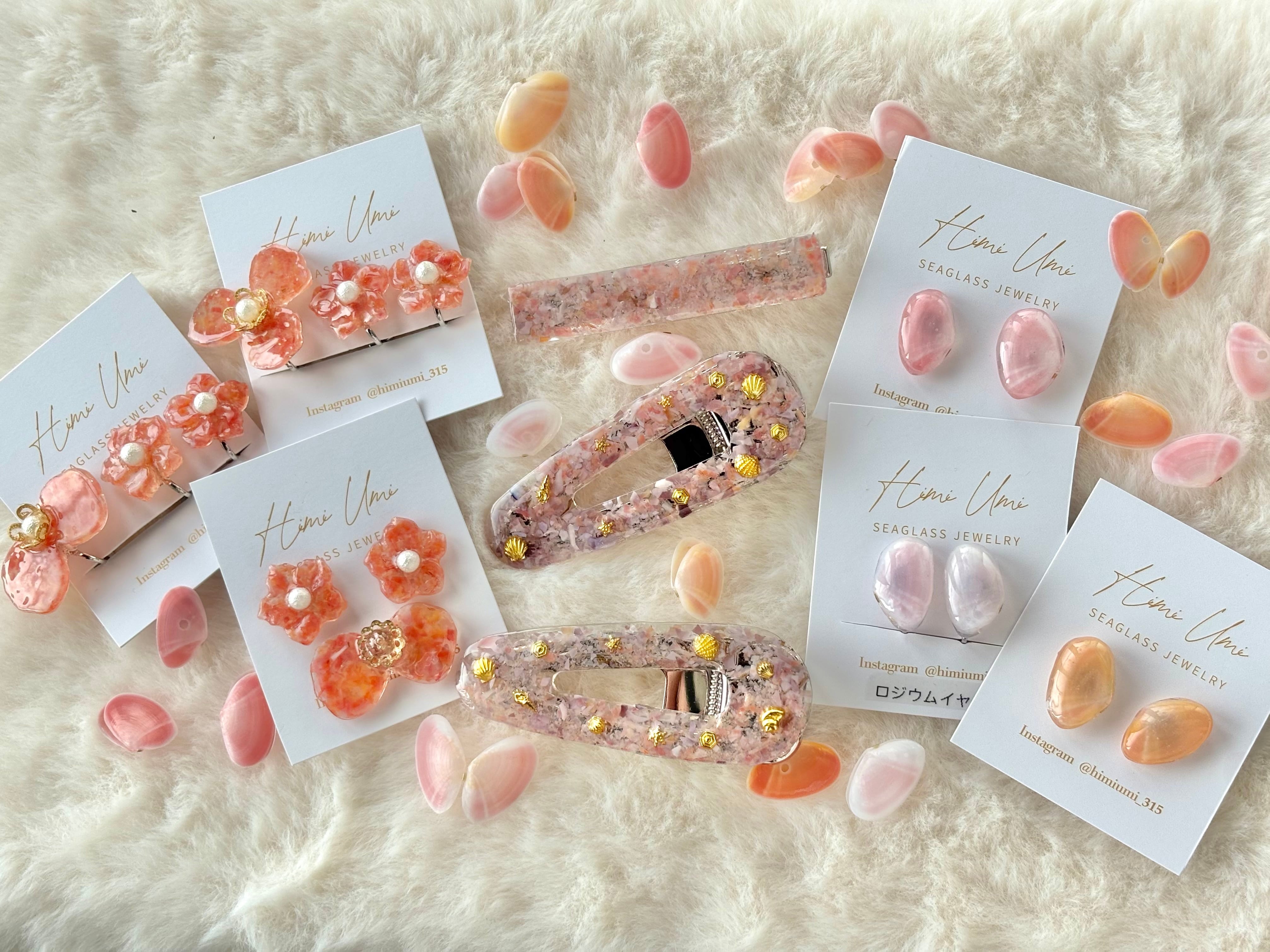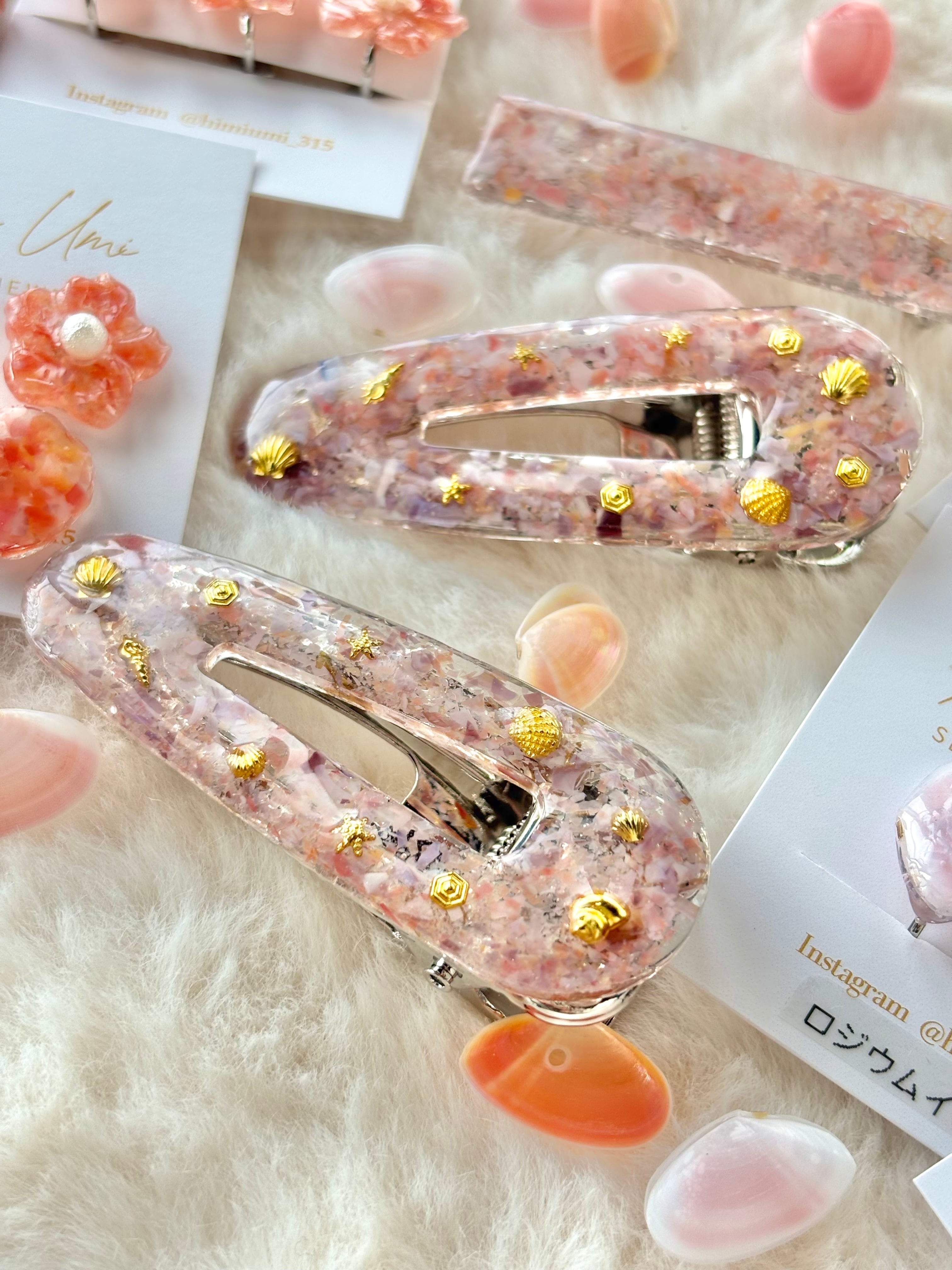 - サクラガイとムラサキガイを砕いてフレークにし、ヘアクリップにしました。
