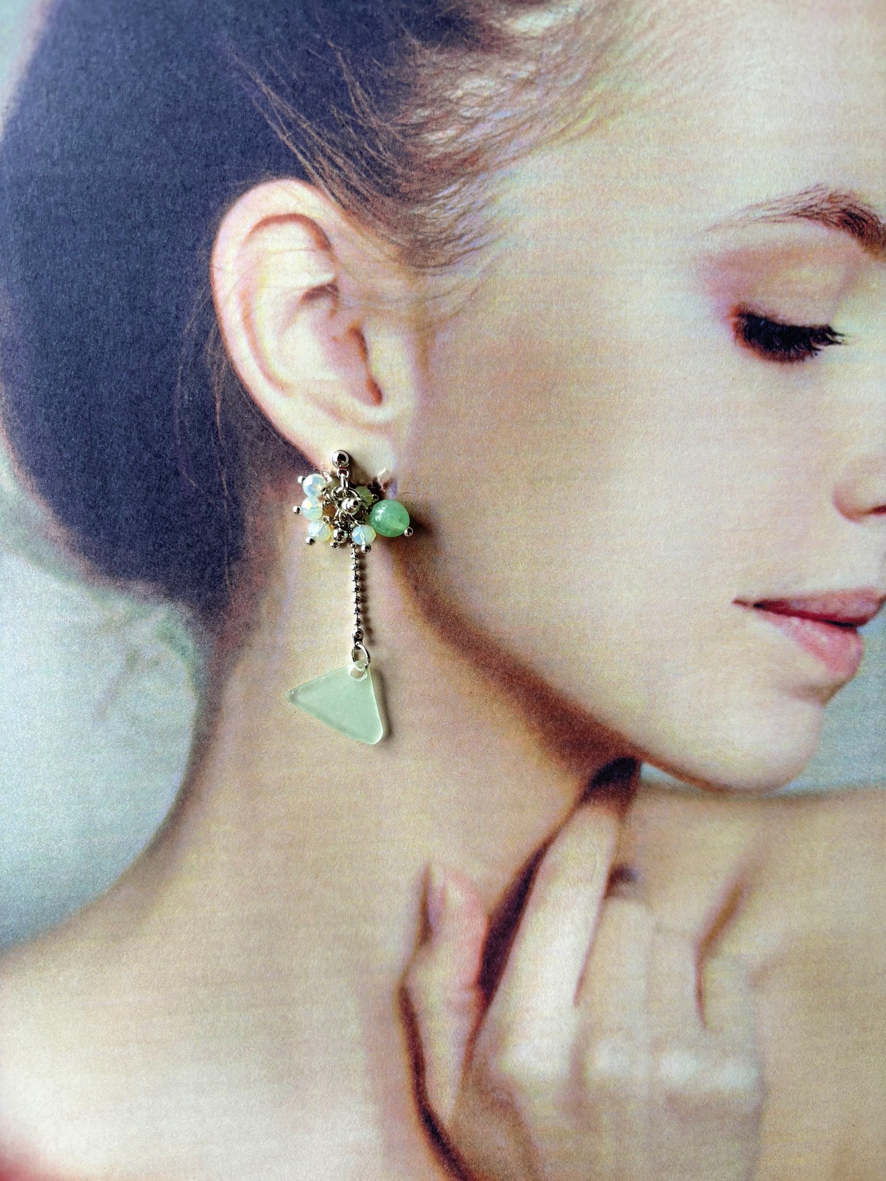 厳選された天然石と氷見シーグラスを使用した特別なアクセサリーです。軽やかな着け心地で、耳元で揺れるシーグラスが自然のエレガンスを引き立てます。天然石の優しい輝きと、シーグラスの独特の色合いが調和し、どんなスタイルにもぴったりフィットします。カジュアルな日常使いはもちろん、特別な日の装いにもアクセントを加える一品です。自分へのご褒美や、大切な方への贈り物としても喜ばれること間違いなしです。